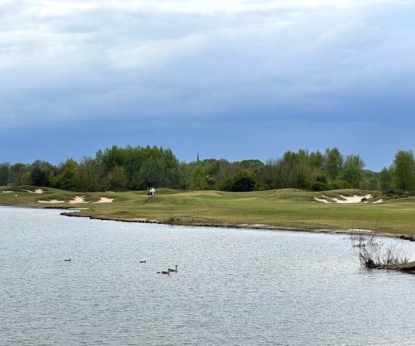 The back-nine continues the open heathland theme, with good-width gently-rolling fairways throughout. For this inward half, the flat farmland beyond the course is complemented by a good-sized lake (the result of the area's sand quarrying activities). The par-4 10th, par-3 14th and par-5 13th and 17th holes are all played along the lake's shoreline. The island-green short par-4 9th (with its testing approach) serves notice of the waterscapes to come on the back-nine.